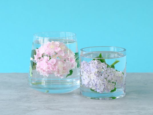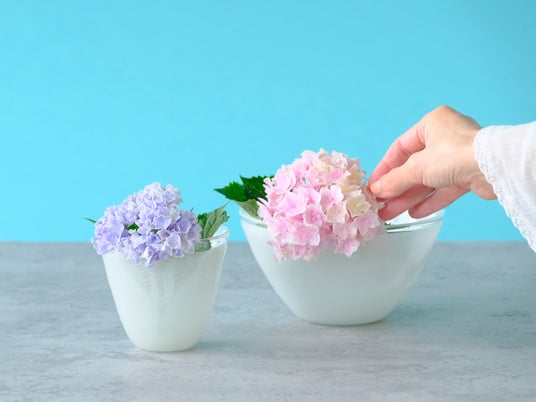 アジサイと水は相性抜群。日持ちはしませんが、花を水に閉じ込めて水中花も楽しめます。 水が濁ってきますので毎日水替えを行いましょう。