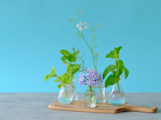カッティングボードに一輪挿しを並べて。花の高さを揃えないほうがナチュラルで素敵に仕上がります。