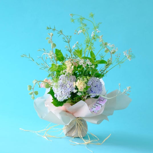 アジサイにハーブを添えたフレッシュなブーケです。さり気ないプレゼントはもちろん、ご自宅に季節感を取り入れるアイテムにも。