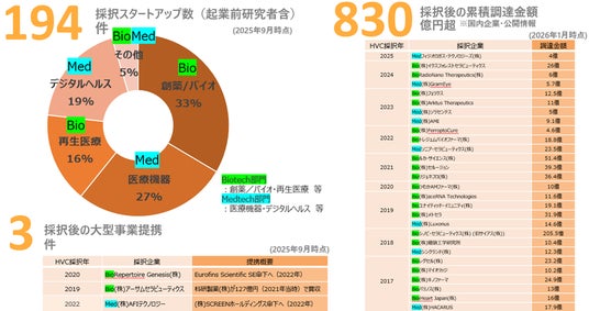 ヘルスケア産業の裾野を広げ、スタートアップの国境を越えたビジネス展開支援を目的とし、2016年より実施する本プログラムも10期目を超えました。これまでの採択スタートアップは194件(創業前の案件含む)にのぼり、採択後資金調達額は累積830億円(2026年1月時点・公開情報・国内企業限り)を超え、海外拠点開設・大型事業提携・J-startup認定・AMED事業採択など、過去登壇者は目覚ましい活躍をされています。
