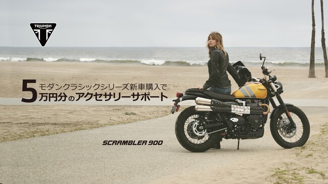 期間中にトライアンフの正規販売店にて、モダンクラシック・シリーズの新車をご成約(新規ご登録)いただいたお客様に、「純正アクセサリーご購入金額5万円」をサポートいたします。