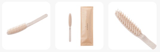 ブラシ全体にもみ殻が使用されたエコなヘアブラシ。折りたたまないストレートタイプで手にフィットする形状を追求しました。もみ殻由来の歯ブラシ・カミソリとセットで導入することで、統一感のある客室アメニティを提供できます。また、パッケージは個包装の袋タイプを採用しているため、衛生的です。