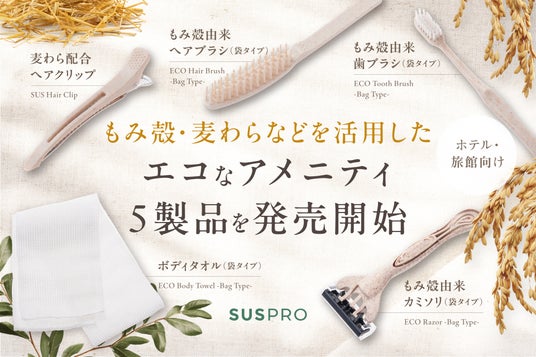 そこで今回、SUS amenityからもみ殻・麦わら・クラフト紙を活用したエコなアメニティ5種を新発売。環境への配慮とコストパフォーマンスを両立し、ホテル・旅館が持続可能な運営をしながら、上質な客室空間を演出できるアイテムです。