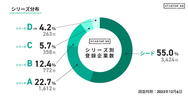 今回、定義の対象となった資金調達済スタートアップ企業6,229社のシリーズを調査したところ、シードが3,424社で55.0%、シリーズAが1,412社で22.7%、シリーズBが772社で12.4%、シリーズCが358社で5.7%、そしてシリーズD以降が263社で4.2%という結果になりました。