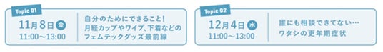 ZOOMカウンセリングは、事前申込制で健康や他者とのコミュニケーションなど多岐にわたる悩みを臨床心理士・不妊症看護認定看護師・キャリアコンサルタントなどの専門家に無料で気軽にご相談いただくことが可能です。また、11月と12月には、「フェムテックグッズ最前線」「ワタシの更年期症状」 などのテーマを設定し、誰でも気軽に専門家と話せる場として、事前申込なしで入退出自由なオンライン「ZOOM座談会」も開催します。