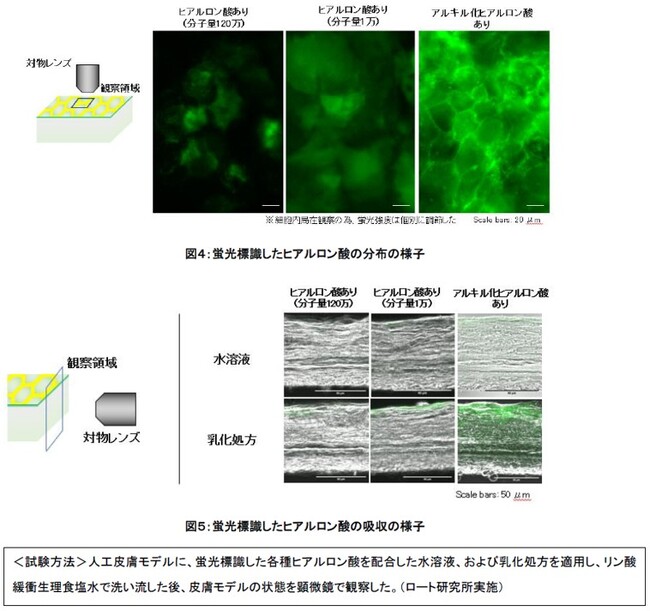 ロート製薬は、皮膚にとって特に重要な機能性成分としてヒアルロン酸に着目し、表皮における保水機能や皮膚細胞内でのはたらきについて研究してきました。近年、ヒアルロン酸の分子量の違いや修飾化による皮膚への経皮吸収挙動について、三次元人工培養皮膚モデルを用いて検討し、それぞれ角層への吸着挙動が異なることを明らかにしてきました(図1)。