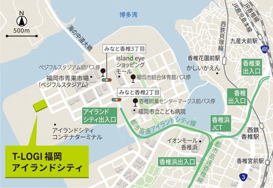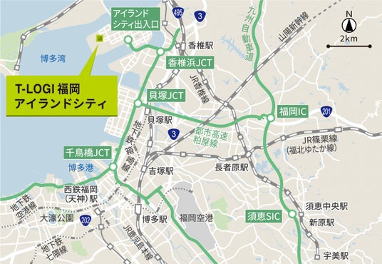 本物件は福岡高速6号線「アイランドシティ」出入口から約1.4kmの場所に位置し、九州圏の一大消費地である福岡市内博多駅周辺まで約15分で配送することができる、都市中心部近接の好立地です。また、九州の大動脈である九州自動車道「福岡」ICまで車で約13分のアクセスであることから、九州全域への広域配送拠点および本州と九州全域をつなぐ配送拠点としての運用が可能であり、配送時間の短縮によって2024年問題に伴う長距離ドライバー不足の軽減も期待されています。