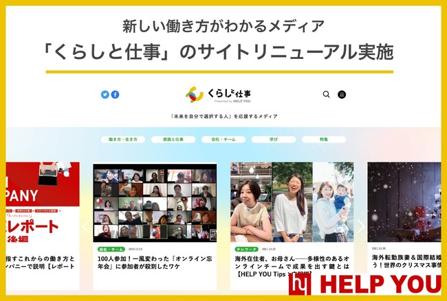 オンラインアウトソーシングサービス「HELP YOU(ヘルプユー)」を運営する株式会社ニット(本社:東京都品川区、代表取締役社長:秋沢崇夫、以下ニット)は、2015年よりフルリモート前提で創業し、現在、約400人が日本全国・世界33カ国からオンラインで業務を遂行しています。2021年12月23日、ニットが運営するメディア「くらしと仕事」のサイトリニューアルを実施したことをお知らせいたします。読者ターゲットである「働く人」がより必要な情報にたどり着けるようサイト設計・デザインを刷新しました。リニューアルのポイントをご紹介します。