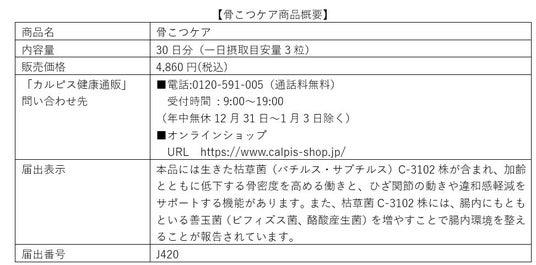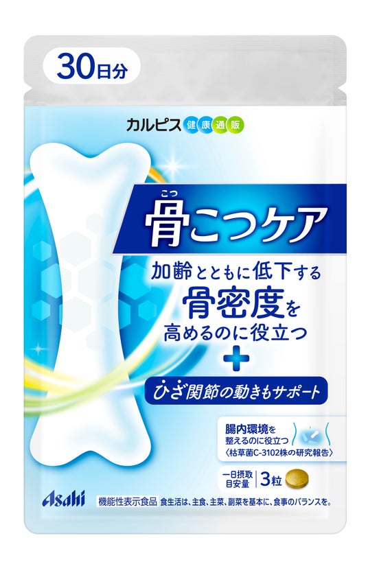アサヒグループ食品株式会社(本社 東京、社長 川原浩)は、健康食品の通信販売ブランド「カルピス健康通販」で販売している機能性表示食品『骨こつケア』について、配合成分である「枯草菌(バチルス・サブチルス) C-3102株」に新たに「ひざ関節」に対する機能が報告されたため、2月17日からパッケージに機能性表示を追加しリニューアル発売します。中身や価格に変更はありません。