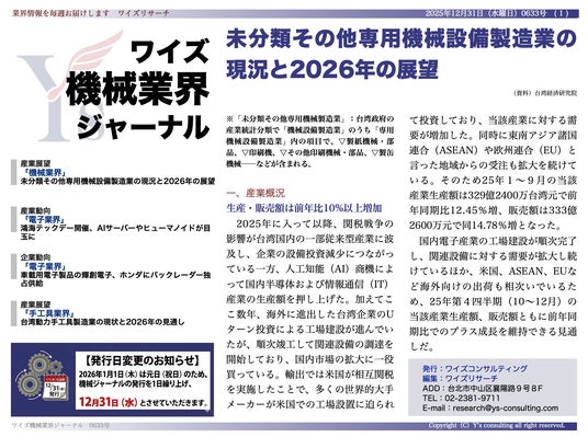ワイズコンサルティング グループ(本社:中華民国台北市、代表取締役:吉本康志)は台湾機械業界専門誌「ワイズ機械業界ジャーナル」の2025年12月第4週号を発行しました。