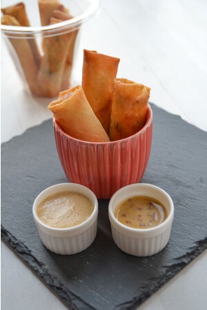 外はパリッと中はふんわり食感が特徴のお魚のすり身 で作った春巻きです。 お魚のすり身には豆腐・しそ・チーズ・枝豆を練り込 み、選べるディップソース(明太マヨ・ハニーマスタ ード)によって変化する味わいは通常の春巻きとは違 った美味しさが楽しめます。 食べやすくスティック状になっておりますので、おつ まみに最適です。