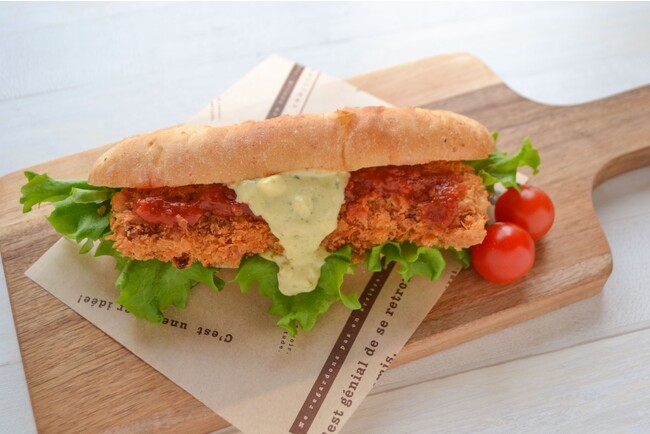 カニカマとカニ身でつくったカニカマフライを、風味 豊かなバジルタルタルソースとさっぱりとしたあらご しトマトソースでサンドしました。 歯切れの良い程よいもっちり感のあるパンが美味しさ を引き立てます。