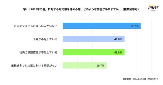 「2025年の崖」に対する対応策を進める際、どのような弊害があるかについて質問したところ、「社内でシステムに詳しい人がいない(52.7%)」が最多意見でした。次いで「予算が不足している」、「社内の課題認識が不足している」が41.8%(同率)となりました。
