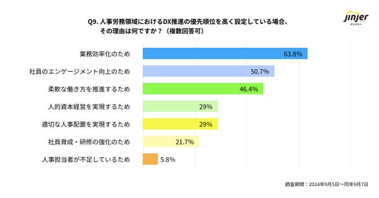 人事労務領域におけるDX推進の優先順位を高く設定している企業を対象に、その理由を質問したところ、1位は「業務効率化のため(63.8%)」、2位は「社員のエンゲージメント向上のため(50.7%」でした。その他の意見としては「人的資本経営を実現するため(29%)」や、「適切な人事配置を実現するため(29%)」といった回答もありました。