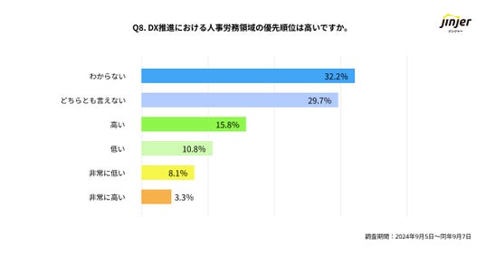 人事労務業務のDX推進に対する優先度については、「わからない(32.2%)」、「どちらとも言えない(29.7%)」という回答が多く見られ、企業が優先順位の判断に迷っている状況が伺えます。