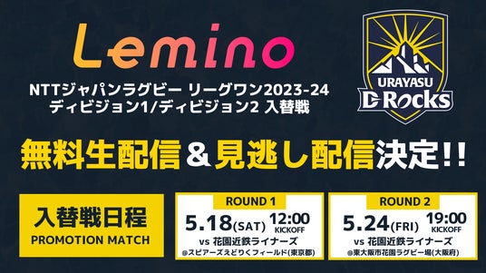 株式会社NTTドコモ(以下、ドコモ)の映像配信サービス「Lemino(R)」で無料ライブ配信する、NTTジャパンラグビー リーグワン2023-24 ディビジョン1/ディビジョン2入替戦について、対戦カードが決定しました。Leminoでは、NTTドコモがトップパートナーを務める浦安D-Rocksが出場する2試合を無料ライブ配信いたします。