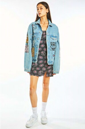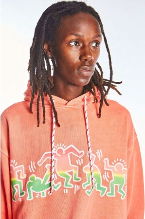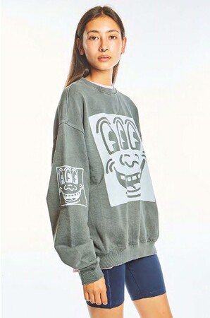 キーアイテムには、レザーの袖にダンシングドッグのバッジ、胸にシェニエール織のハートの顔をあしらったバーシティジャケット、ヘリングのクラシックなダンスフィギュアのパッチワークが配されたユニセックスのアメリカンフィットデニムジャケットなどが揃います。ヴィンテージ・アメリカーナにインスパイアされたニットやジャンパー、フーディーには、若者の無邪気さ、生来の善良さ、彼らしか持ちえない可能性を象徴する ”ラディアント・ベビー” や、ポップショップで大きく取り上げられた “スリーアイドフェイス” などのアイコンが登場します。