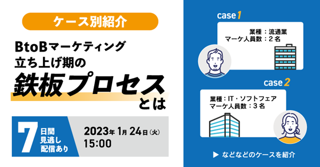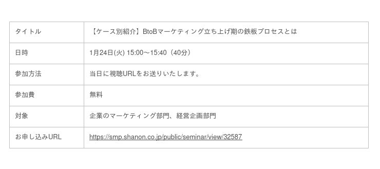 株式会社シャノン(本社:東京都港区、代表取締役社長:中村 健一郎)は、「これからBtoBマーケティングを強化したい」というお客さまにむけて、立ち上げ期の環境整備から施策実施にいたるまでの内容をケーススタディ形式でご紹介するウェビナーを1月24日(火)に開催します。