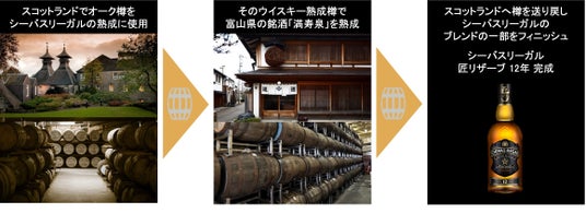 『シーバスリーガル 匠リザーブ 12年』で用いた“日本酒カスク”は、スコットランドと日本(富山県)を往復することで作り出されます。まず、シーバスリーガルのウイスキー熟成に使用したオーク樽をスコットランドから日本に送り、富山県の桝田酒造店で銘酒「満寿泉」を寝かせます。その特別な樽を再度スコットランドへ送り戻し、12年以上熟成した「シーバスリーガル」のブレンドの一部をフィニッシュしています。この“日本酒カスク”でフィニッシュした製法は、スコッチウイスキーでは前例のない、革新的な試みです。