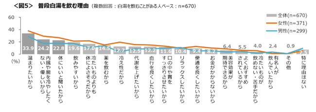 白湯を飲む理由のTOP3は「温まりたいから」、「内臓や腸を冷やしたくない・優しいから」、「体にいいと聞いたから」。白湯を飲むことによる健康効果への期待感が特に女性では強い。 <図5>