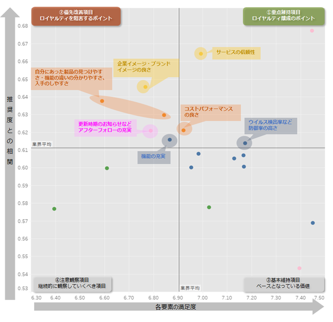 セキュリティソフトのロイヤルティの要因を19の項目別に分析したところ、業界全体では「サービスの信頼性」や「コストパフォーマンスの良さ」、「ウイルスの検出率など防御率の高さ」といった項目がロイヤルティ醸成につながる結果となりました。