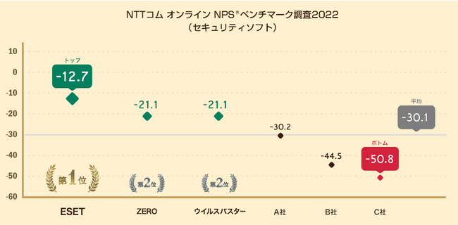 対象のセキュリティソフト6社のうち、NPSのトップは6年連続でESET(-12.7ポイント)となりました。2位は同率となり、ZERO(-21.1ポイント)、ウイルスバスター(-21.1ポイント)となりました。対象6社のNPS平均は-30.1ポイント、トップ企業とボトム企業の差は38.1ポイントとなりました。