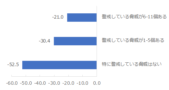 警戒しているサイバー攻撃やインターネット上の脅威の数別にNPSを分析したところ、警戒している脅威の数が6個から11個ある利用者のNPSは-21.0ポイントとなった一方、特に気にしている脅威はないと回答した利用者のNPSは-52.5ポイントとなりました。サイバー攻撃やインターネット上の脅威について危機意識を持っている利用者ほどNPSが高い傾向となり、利用者のインターネットセキュリティに対する意識を高めていくことの重要性が示唆される結果となりました。