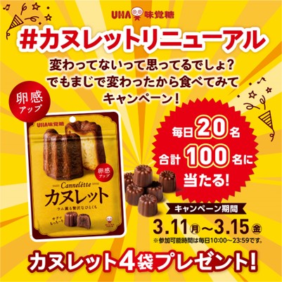 「#カヌレットリニューアル ~変わってないって思ってるでしょ?でもまじで変わったから食べてみてキャンペーン~」を2024年3月11日(月)10時から実施致します。UHA味覚糖公式X(@UMikakuto)で実施されるフォロー&リポストキャンペーンに参加頂いた方から毎日20名様に合計で100名様にリニューアルした「カヌレット」が当たるキャンペーンを実施します。