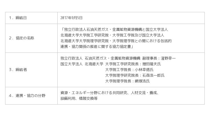 JOGMEC(本部:東京都港区、理事長:黒木啓介)は、国立大学法人北海道大学(総長:名和豊春氏)と、9月5日、資源・エネルギーに関する我が国の学術および技術開発の発展に資することを目的として、包括的な連携・協力の枠組みに関する基本協定を締結しました。