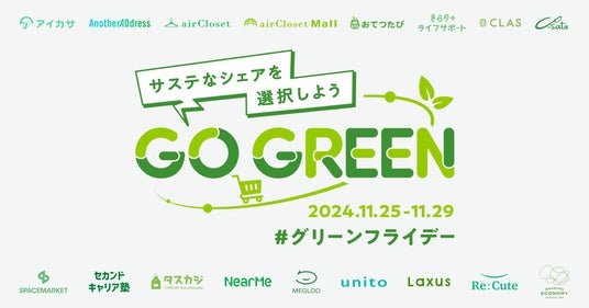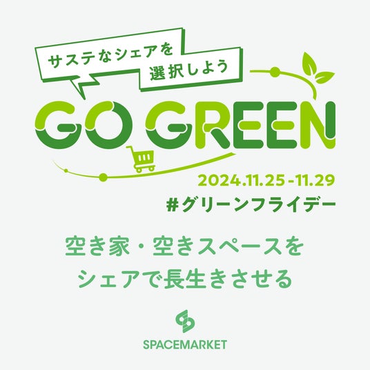 あらゆるスペースを貸し借りできるマーケットプレイス「スペースマーケット」を運営する株式会社スペースマーケット(本社:東京都渋谷区、代表取締役社長:重松大輔、以下、スペースマーケット)は、欧州を中心に広がるサステナブルな消費を促す2024年11月29日のグリーンフライデーに合わせ、一般社団法人シェアリングエコノミー協会(以下、シェアエコ協会)とスペースマーケットを含むシェアサービス事業者15社(16サービス)が消費について考えるきっかけ作りとしてサステナブルアクション「GO GREENプロジェクト」を行います。