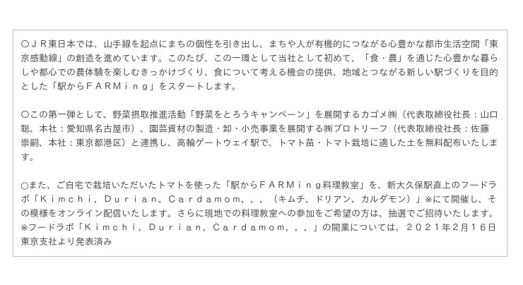(4)参加方法 オンライン配信は、無料配布するトマト苗に添付されている用紙に記載の方法にてアクセスいただくことでお楽しみいただけます。また、現地での料理教室へのご参加は、無料配布するトマト苗に添付されているハガキにてご応募いただきました方の中から、抽選でご招待いたします。