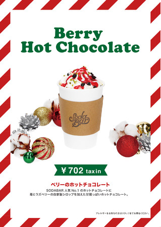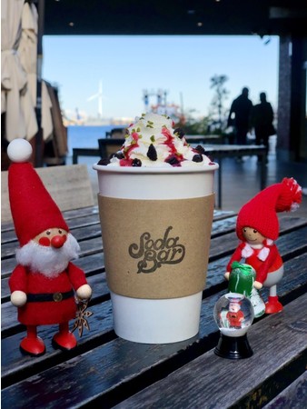 生クリームにイルミネーションのようなベリーシロップをかけて、砕かれたピスタチオとココアビスケットを飾り付け、ホワイトツリーをイメージした「ベリーのホットチョコレート」はSODA BAR全店で販売中。片手にホットチョコレートをデコレーションしたドリンクを持ちながらホリデーシーズン気分を味わってみてはいかがでしょう。