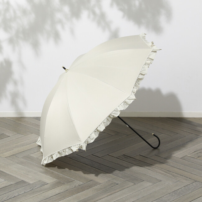 遮光率・UVカット率100%の日傘です。最高水準の遮光率・UVカット率でお肌を日差しからしっかり守ります。遮熱性にも優れ、暑い季節の熱中症対策にも効果を発揮し、はっ水防水加工を施しているので雨傘としてもお使いいただけます。フリルたっぷりのデザインにほっそりとしたスチールの持ち手がレトロな雰囲気で、先端にあしらったゴールドのパーツもクラシックな印象をプラスします。日差しに負けない、エレガントな佇まいを演出してくれるアイテムです。
