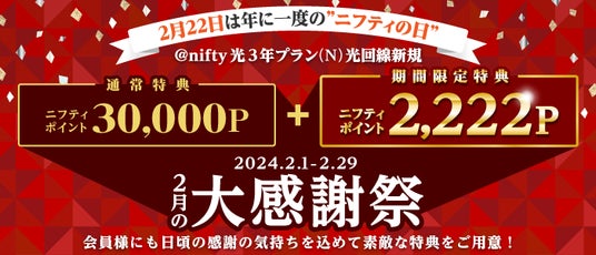 ニフティ株式会社(本社:東京都新宿区、代表取締役社長:前島 一就、以下当社)は、「2月の大感謝祭」を本日2月1日(木)から実施します。