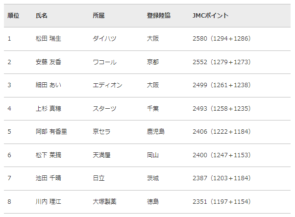 <JMCシリーズIIポイントランキング トップ8(女子)>