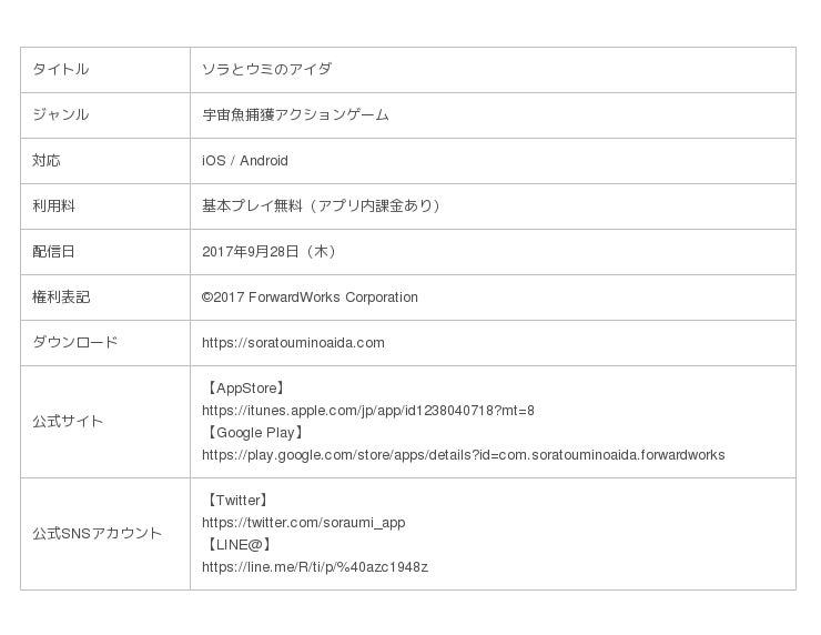 株式会社フォワードワークス(以下、FW)は、スマートフォン向け宇宙魚捕獲アクションゲーム『ソラとウミのアイダ(以下ソラウミ)』において、2018年12月6日(木)より、新イベント「ゴールデンカジキ捜索作戦」を開催いたします。本イベントでは、進路が分岐した専用のイケスが登場し、イケスの奥に潜むボス宇宙魚を討伐するとイベントポイント「極上の切り身」が手に入ります。イケスの最奥で出現するボス宇宙魚は3種類で、大当たりの「ゴールデンカジキ」を捕獲すると大量の「極上切り身」が手に入ります。今回のイベントに合わせて登場した新守護神は「鮪魚類」に有効なステータスを持っています。