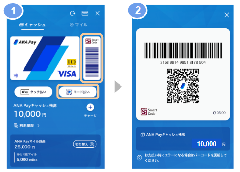 1.ANA Payホーム画面のコード払いボタンまたはSmart Codeバーコードをタップ