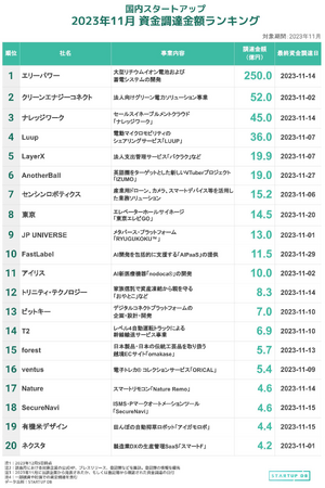 成長産業支援事業を推進するフォースタートアップス株式会社(本社:東京都港区、代表取締役社長:志水雄一郎 以下、フォースタートアップス)は、継続的に国内スタートアップ動向に関する調査を行い、当社サービスである「STARTUP DB(スタートアップデータベース)」に調査結果を公開しています。今回は、2023年11月に発表された「国内スタートアップ資金調達金額ランキング(2023年11月)」を発表いたします。