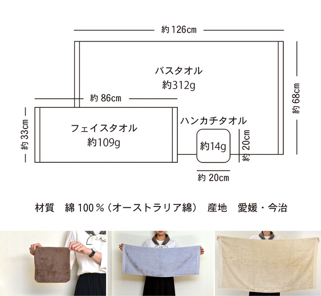 サイズ展開:バスタオル・フェイスタオル・ハンカチタオル