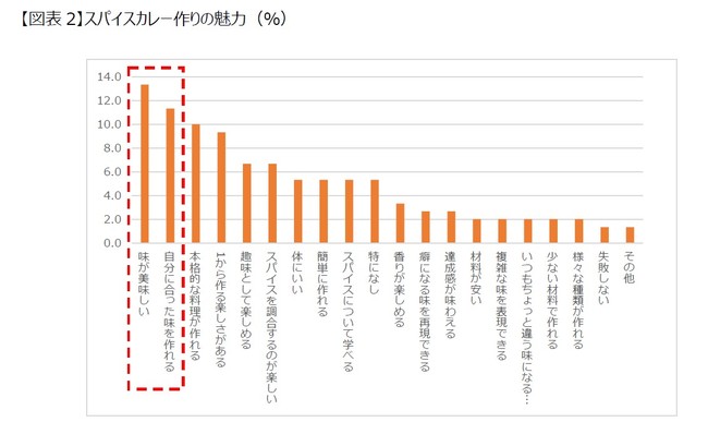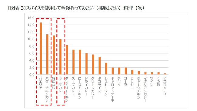 「スパイスカレー作りの魅力」では、「味が美味しい」の割合が高く、次いで「自分に合った味を作れる」点にも魅力を感じていることが明らかになりました。また、スパイスを使って作ってみたい料理としては、「パエリア」「バターチキンカレー」「キーマカレー」が上位でした。