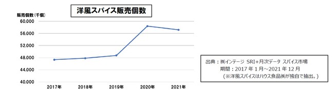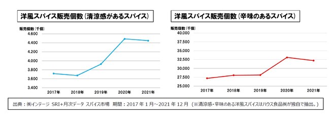 近年、スパイス市場は順調な成長を続けています。なかでも洋風スパイス市場は拡大しており、直近5年間を見ても、洋風スパイスの販売規模は家庭内調理の需要が高まった影響もあり、2021年の販売個数は2017年から121%と大きく伸長しました。またカルダモンなどの清涼感があるスパイスやレッドペパーやブラックペパーなどの辛味のあるスパイスの需要が、2017年から2021年にかけて伸長しています。