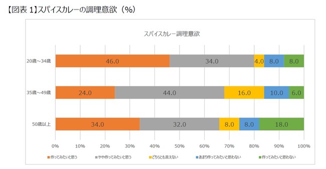 新型コロナウイルス感染症の拡大により内食機会が増加した影響で、自宅での調理にこだわる人が増え、スパイスカレー作りもトレンドになっています。ハウス食品が実施したアンケート調査では、スパイスカレーを調理したことがない人に「スパイスカレーを調理したいと思うか」を尋ねたところ、「作ってみたい」「やや作ってみたい」と回答した人は、20~34歳では80%、35~49歳では68%、50歳以上では66%という結果で、特に若年層のスパイスカレー調理意欲が高いことがうかがえます。