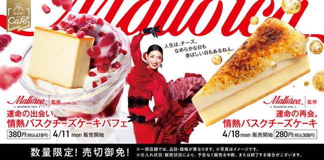 株式会社あきんどスシロー(本社:大阪府吹田市、代表取締役社長:新居 耕平)は、スペイン王室御用達の老舗パティスリー『マヨルカ』監修のスイーツ2種、「運命の出会い。情熱バスクチーズケーキパフェ」を4月11日(月)から、「運命の再会。情熱バスクチーズケーキ」を4月18日(月)からそれぞれ販売いたします。