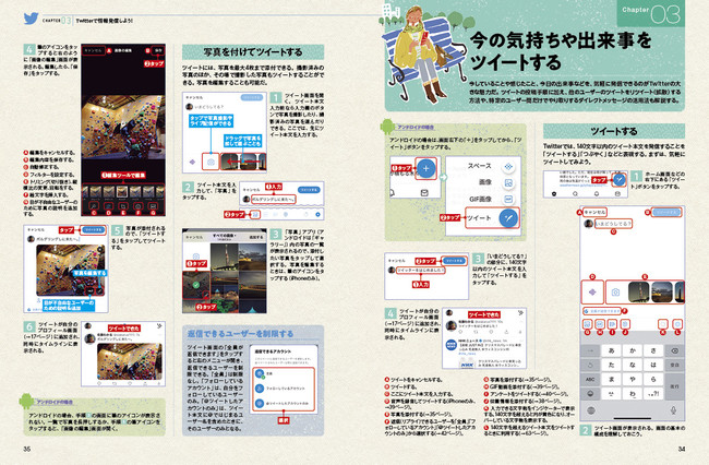 もちろん読むだけでなく、誰でも手軽に情報発信をできるのがTwitterの特徴。本書では、ツイートの投稿方法を初歩から解説しており、写真をつけたツイートやツイートへの返信(リプライ)の仕方などをしっかりマスターできます。