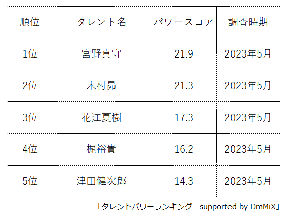 本ランキングは、2023年5月度に実施したタレント調査データ(一部過去実施データ)を利用し、タイトルに応じてランキング形式でまとめたものです。