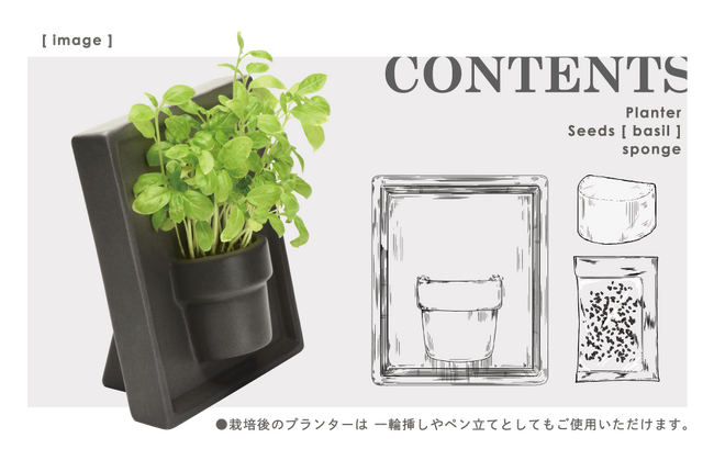 額縁に見立てた陶器のプランターの中で付属のバジルを育てていくと、まるで絵画が成長していくように見える、新感覚のグリーン栽培キットです。