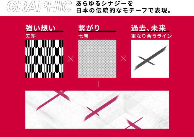 ラインのグラフィックには、日本古来の縁起の良い絵柄とされている矢絣と七宝柄を採用しています。矢絣は強い思い、七宝柄はつながりが表現されています。