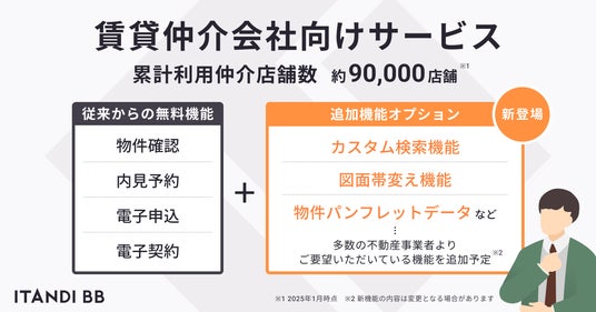これらの実績と成長を背景にさらに顧客満足度を高めるため、今春よりイタンジは、「ITANDI BB」の追加機能オプション(有料)を順次提供を開始いたします。これにより、仲介会社の業務効率化や意思決定を支援するさらに高機能な付加価値を提供してまいります。