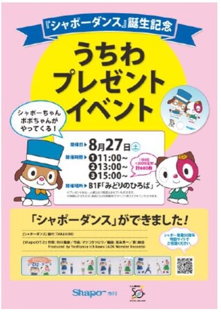 シャポーダンス誕生を記念して、シャポーちゃんポポちゃんがシャポー館内で、ダンスの紹介を兼ねてオリジナルうちわをプレゼントするイベントを開催します。ぜひご来館ください。