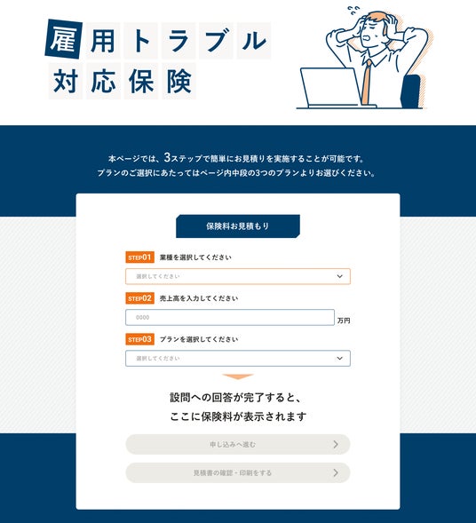 本商品で提供される補償は、従業員を雇用する企業が最低限備えるべき内容に限定しており、シンプルな商品設計とお手頃な保険料を実現しています。さらに、見積もりの請求から加入手続きの完了までオンラインで完結できるため、忙しい人事・労務担当者の方でも時間や場所を選ばずに検討・契約を進めることが可能です。